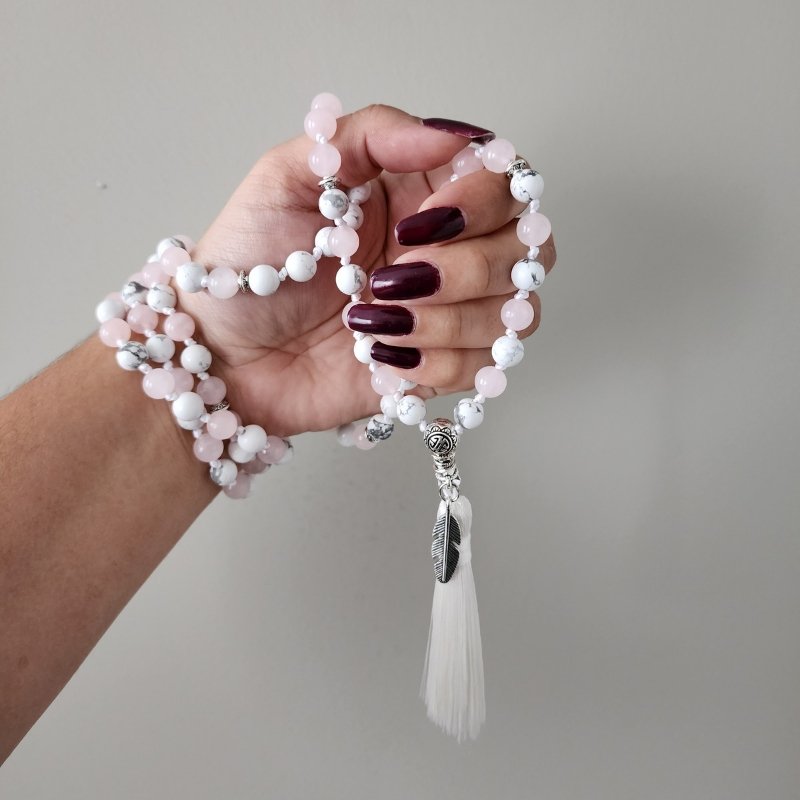 This Japamala is the perfect tool to connect with yourself, your inner self, your femininity, your self-love and calmness. By combining howlite and rose quartz, you can experience the following benefits: